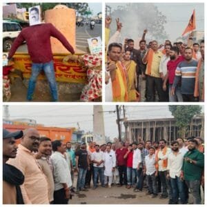 बिलासपुर। न्यायधानी बिलासपुर में धर्मांतरण को लेकर छत्तीसगढ़ प्रदेश में एक बार फिर राजनीति गरमा गई है। कोटा कांग्रेसी विधायक अटल श्रीवास्तव ने हिंदूवादी संगठन लोगो को भगवा गुंडा कहां है इसके बाद मामला तुल पकड़ लिया है। विरोध में हिंदूवादी संगठनों ने कोटा विधायक अटल श्रीवास्तव का पुतला दहन किया है और हिंदूवादी संगठन का विरोध जारी है। इससे पहले भी प्रदेश में धर्मांतरण को लेकर गाहे बगाहे राजनीति होती रहे है।और भगवा गुंडा कहने के बाद हिंदूवादी संगठन में खासा आक्रोश देखा जा रहा है।