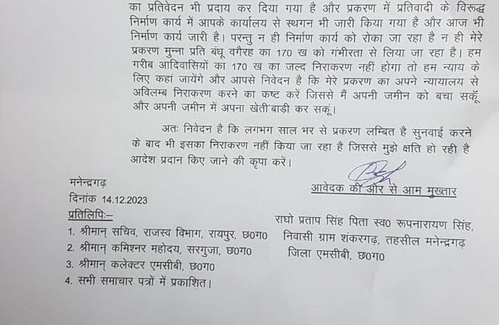 मनेंद्रगढ़,जिला,एम,सी,बी शंकरगढ़ निवासी राघो प्रताप सिंह पिता स्व० रूपनारायण सिंह ने अनुविभागीय अधिकारी (रा०) मनेंद्रगढ़ जिला एमसीबी को आवेदन सौंप…