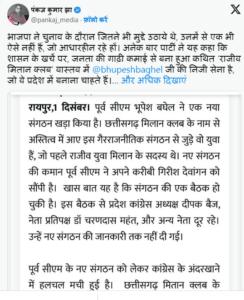 पंकज कुमार झा ने एक्स पर ट्वीट कर लिखा, भाजपा ने चुनाव के दौरान जितने भी मुद्दे उठाये थे, उनमें से एक भी ऐसे नहीं हैं, जो आधारहीन रहे हों. अनेक बार पार्टी ने यह कहा कि शासन के खर्चे पर, जनता की गाढ़ी कमाई से बना हुआ कथित ‘राजीव मितान क्लब’ वास्तव में भूपेश बघेल की निजी सेना है, जो वे प्रदेश में बनाना चाहते हैं. उन्होंने एक समाचार की कटिंग को पोस्ट करते हुए लिखा, इस समाचार को देखिए और समझिये कि इस मामले में भी भाजपा कितना सही थी. प्रदेश भर में उन्होंने ऐसा एक अवैधानिक संगठन खड़ा करने की कोशिश की थी, जो केवल व्यक्तिशः भूपेश जी के लिए जिम्मेदार था. सरकार तो छोड़िए, स्वयं उनकी पार्टी के लोग भी उनसे ऐसे मामले से सहमत नहीं थे.