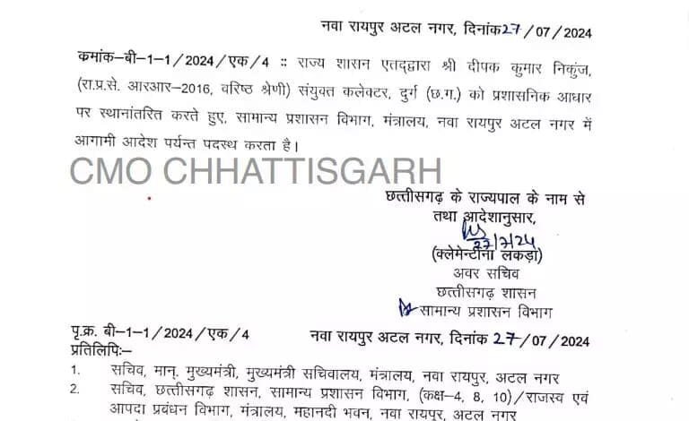 Read More »रायपुर। राज्य शासन ने आज दुर्ग जिले के संयुक्त कलेक्टर दीपक कुमार निकुंज का तबादला आदेश जारी किया है।