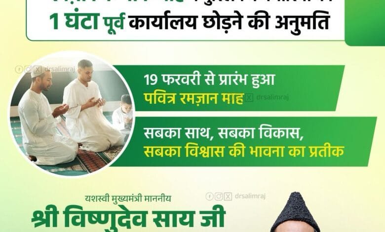 Read More »पवित्र माह रमज़ान में शासकीय मुस्लिम कर्मचारियों को 01 घंटा पूर्व कार्यालय छोड़ने की अनुमति सरकार का सराहनीय कार्य –…