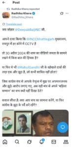 दीपक बैज का मोबाइल चोरी के बाद बीजेपी नेत्री राधिका खेरा ने बोला बड़ा हमला, कहा “अब 30 अप्रैल 2024 की शाम वाला CCTV वीडियो भी दिखाइए”