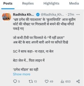 भाजपा नेत्री राधिका खेरा ने पूर्व सीएम भूपेश बघेल पर हमला करते हुए कहा “बेटा जेल में…पिता लाइन में”