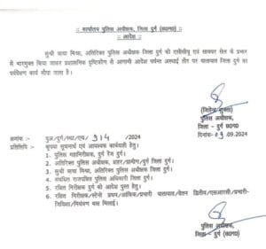 दुर्ग जिले के पुलिस अधीक्षक जितेंद्र शुक्ला ने सोमवार को एक आदेश जारी किया कि अतिरिक्त पुलिस अधीक्षक सुश्री ऋचा मिश्रा जिला दुर्ग को एसीसीयू एवं सायबर सेल जिला दुर्ग के प्रभार से भारमुक्त कर प्रशासनिक दृष्टिकोण से आगामी आदेश पर्यन्त अस्थाई तौर पर यातायात जिला दुर्ग का पर्यवेक्षण कार्य सौपा जाता है।