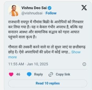 मुख्यमंत्री विष्णुदेव साय ने गौ तस्करों से कहा या तो सुधर जायें, नहीं तो छत्तीसगढ़ छोड़ दें