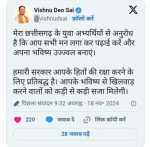 मुख्यमंत्री विष्णुदेव ने पीएससी के पूर्व चेयरमैन टामन सिंह सोनवानी की गिरफ्तारी को लेकर किया ट्वीट