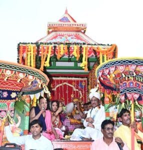 मुख्यमंत्री साय ने हजारों श्रद्धालुओं के साथ भक्तिभावपूर्वक रथ यात्रा में भाग लिया। श्रद्धालुओं ने भगवान श्री जगन्नाथ, भाई बलभद्र एवं बहन सुभद्रा के रथ को रस्सी खींचकर आगे बढ़ाया। पूरा वातावरण जय जगन्नाथ के जयघोष, भजन-कीर्तन और भक्तिमय उल्लास से गूंज उठा। रथ यात्रा मुख्य मार्गों से होते हुए मौसीबाड़ी पहुंची। रथ यात्रा के पावन अवसर पर ओडिशा से आमंत्रित कीर्तन मंडलियों ने भक्ति संगीत की मनमोहक प्रस्तुतियां दीं, जिससे वातावरण भक्तिमय हो उठा। साथ ही रथ यात्रा में अनेक धार्मिक एवं सांस्कृतिक झांकियां भी शामिल रहीं, जो भगवान श्री जगन्नाथ की महिमा और हमारी सांस्कृतिक विविधता की भव्यता को अत्यंत आकर्षक रूप में प्रदर्शित कर रही थीं।