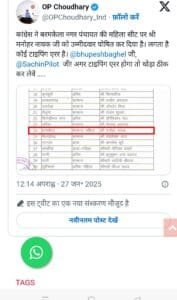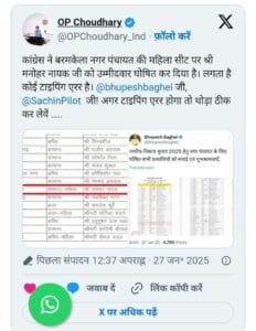 कांग्रेस ने महिला के लिए आरक्षित सीट पर पुरुष को टिकट दिया, मंत्री ओपी चौधरी ने ट्विट कर बताई गलती