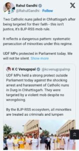 केरल सांसद बेनी बेहनान ने कहा कि दोनों नन मेरे ही लोकसभा क्षेत्र के हैं. मैं उन्हें अच्छी तरह से जानता हूं. देशभर में सबसे अधिक अल्पसंख्यकों को प्रताड़ित किया जा रहा है. बजरंग दल और आरएसएस के दूसरे विंग को बढ़ावा दिया जा रहा है. यहां किसी प्रकार के धर्मांतरण और न ही मानव तस्करी का मामला है. सांसद सप्तगिरि उल्का ने कहा कि बजरंग दल वालों ने सिर्फ महिला नन के कपड़े देखकर उनके साथ अभद्रता की और उन पर मानव तस्करी और धर्मांतरण का आरोप लगाकर पुलिस ने उन्हें जेल में बंद कर दिया है. हम कानूनी तरीके से इस लड़ाई को लड़ेंगे. मुख्यमंत्री विष्णु साय से भी इस विषय पर मुलाकात करेंगे. यहां धर्मांतरण और मानव तस्करी का मामला नहीं है.