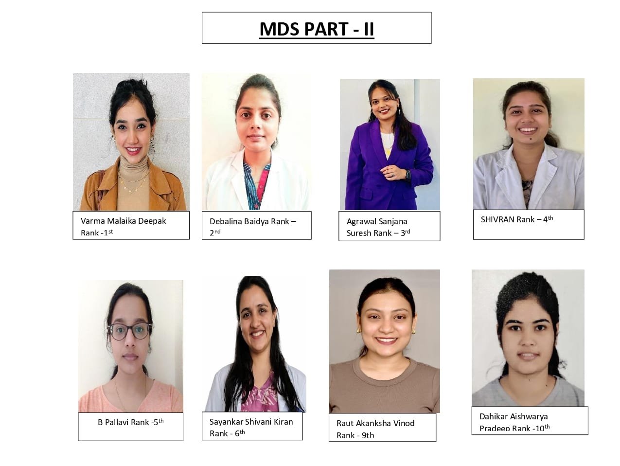 एमडीएस पार्ट. 2 में मलाइका वर्मा (कन्जबेटिव एण्ड एंडोडोंर्टिक्स) ने प्रथम स्थान प्राप्त किया, देवालीना (पेडोडाँटिक्स) ने द्वितीय स्थान प्राप्त किया तथा संजना अग्रवाल (प्रोस्थोडोंटिक्स), सिवरन (कन्जवेटिव एण्ड एंडोडोंटिंक्स), बी. पल्लवी (पेडोडोंटिक्स), सायनकर शिवांणी किरन (पेरियोडोंटोलॉजी), चंदन सिंह (ओरल सर्जरी), राउत अकांक्षा विनोद (पेरियोडोंटोलॉजी), दहिकर ऐश्वर्या प्रदीप (अर्थोडोंटिक्स) ने क्रमशः तीसरा, चौथा, पांचवा, सातंवा, आठवा, नवां एवं दसवा स्थान प्राप्त किया। साथ ही, एक और अच्छी बात यह है कि स्टूडेंट्स और आरसीडीएसआर ने न सिर्फ यूनिवर्सिटी मेरिट हासिल की, बल्कि वे भारत के सभी डेंटल कॉलेजों में सब्जेक्ट टॉपर भी रहे।