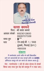 भिलाई। सामाजिक संगठन सर्वधर्म सेवा संस्था की एक आवश्यक बैठक संस्था के अध्यक्ष प्रतीक भोई की अध्यक्षता में 2 दिसंबर को भिलाई निवास में आयोजित की गयी थी। जिसमें संस्था द्वारा चलाये जा रहे अंगदान व देहदान संकल्प अभियान के तहत पिछले चार महीनों में संकल्प किये 17 महादानियों का सम्मान कर संस्था का डोनर कार्ड प्रदान किया गया।