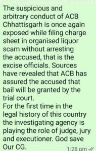 नरेश चंद्र गुप्ता ने X अकाउंट परर ट्वीट करते हुए लिखा है कि “ACB छत्तीसगढ़ का संदिग्ध और मनमाना आचरण एक बार फिर से उजागर किया जाता है, जहां एक्साइज अधिकारियों ने अभियुक्त को गिरफ्तार किए बिना संगठित शराब घोटाले में चार्ज शीट दाखिल करदी है। सूत्रों ने खुलासा किया है कि ACB ने आरोपी को आश्वासन दिया है कि ट्रायल कोर्ट द्वारा जमानत दी जाएगी। इस देश के कानूनी इतिहास में पहली बार जांच एजेंसी न्यायाधीश, जूरी और जल्लाद की भूमिका निभा रही है। भगवान हमारे छत्तीसगढ़ को सुरक्षित रखना।”